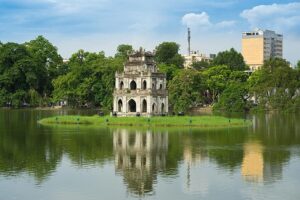 【還劍湖】越南河內市中心主要湖泊之一,原名綠水湖。關於還劍湖有一則神話,傳說在十五世紀中葉,黎太祖曾獲一把神劍之助而擊退中國大軍的侵略,戰後黎大祖遊還劍湖,忽見一隻大龜浮出水面,黎太祖於是用此神劍擲向金龜,不料金龜竟銜著寶劍沈入湖底,從此消失無蹤,便說是神特地派金龜索劍,因名還劍湖,這個故事流傳至今,使人們對還劍湖有一種尊崇的特殊情感